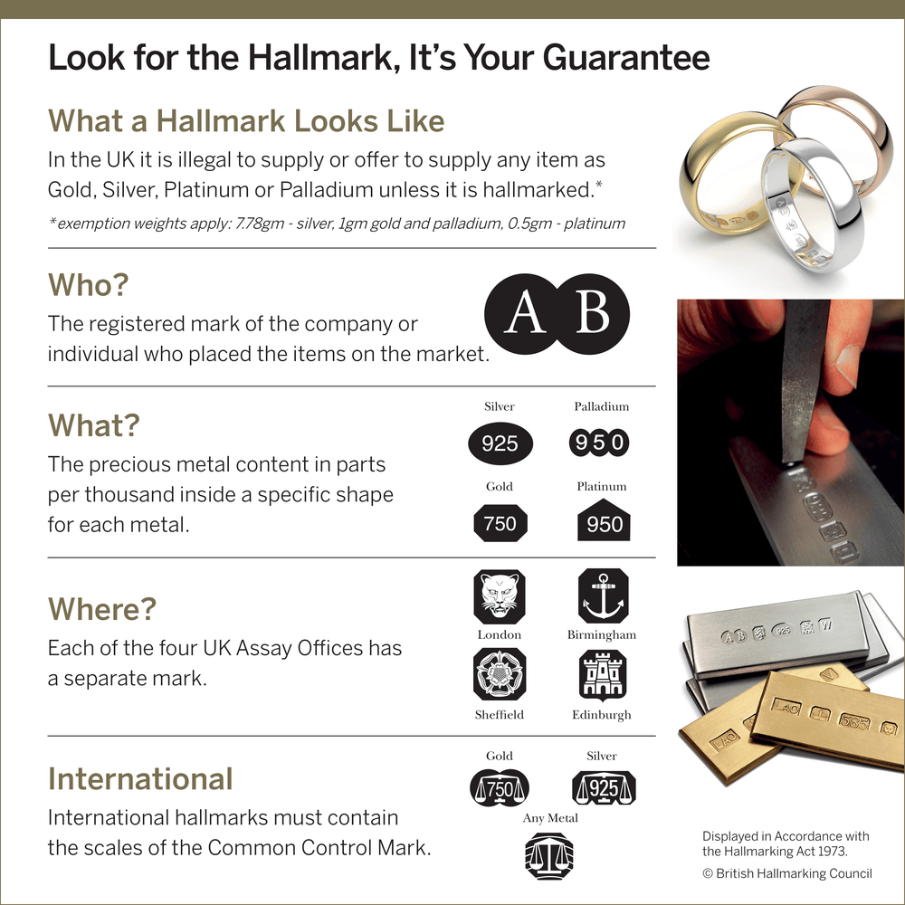 As a registered jeweller, we display the Dealer’s Notice issued by the Assay Office, which explains the meaning of each hallmark symbol and helps customers understand their rights and the protection hallmarking provides.