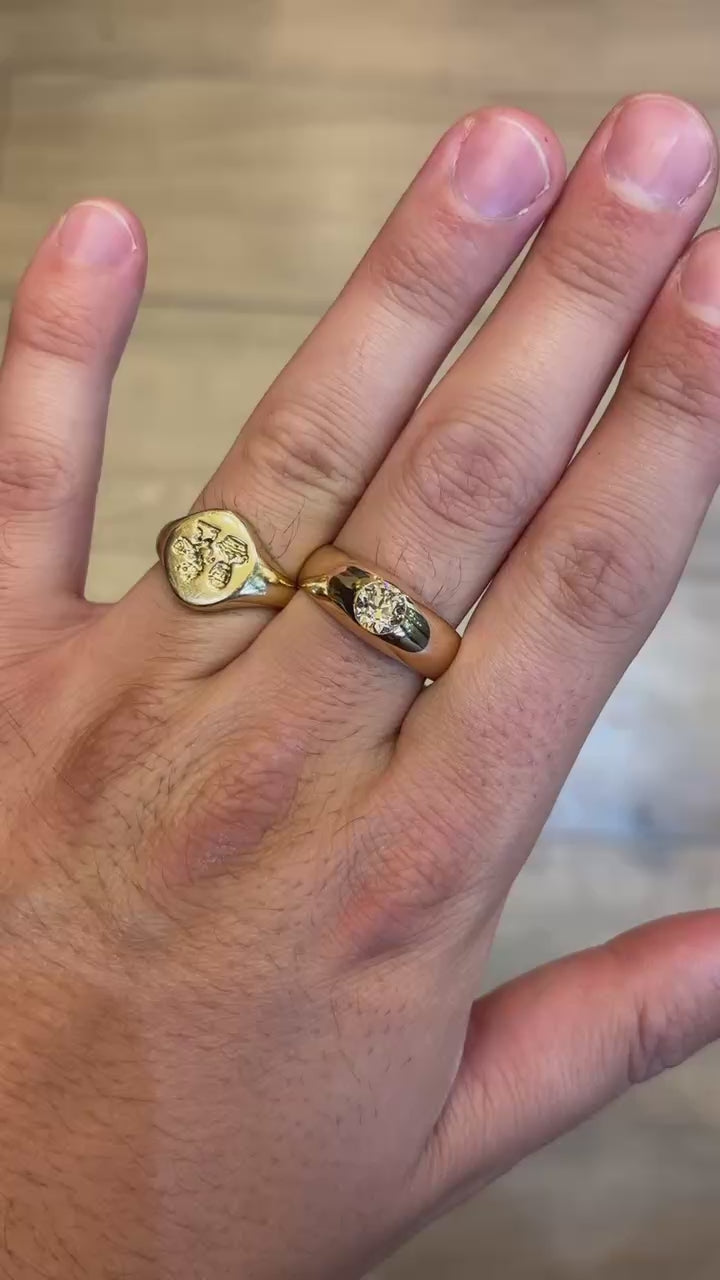 Stunning solitaire diamond gipsy set in thick 18ct yellow gold. This classic gypsy ring showcases a single round Old European cut diamond of approx 0.90ct securely set within a smooth, clean polished band.