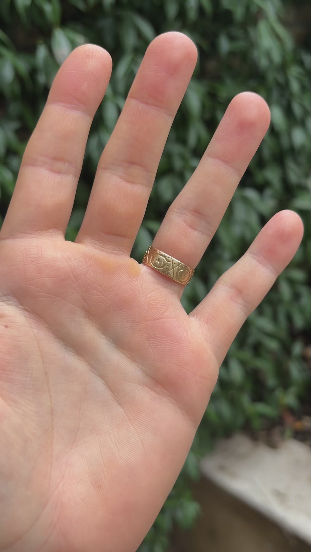 The warm hue of the gold enhances the intricate hand engraving, giving the piece an old-world romance. Elegant on its own or perfect for stacking. The shallow depth of the ring enables it to easily slot underneath an engagement ring.