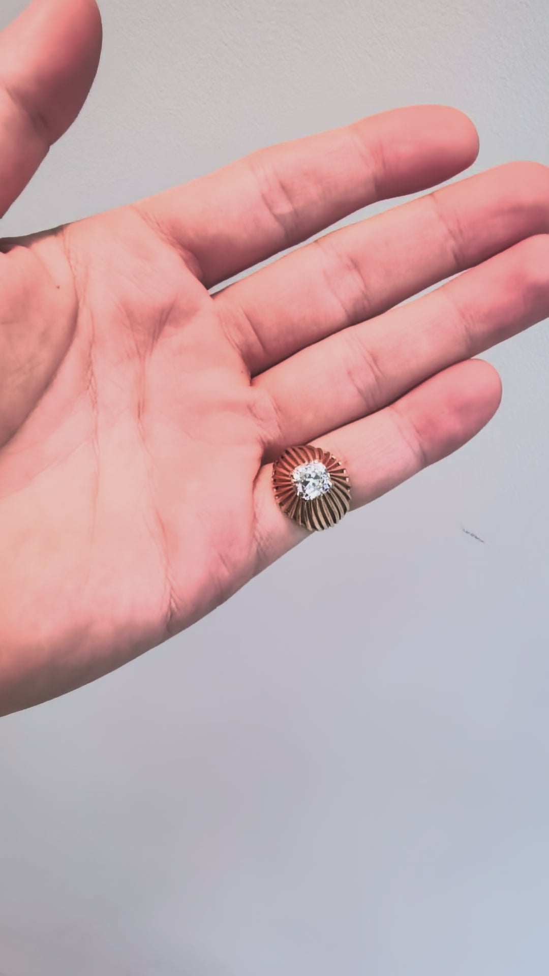 This striking vintage ring is crafted in 18k yellow gold by Chaumet, featuring a bold sunburst design that radiates from a central sparkling diamond.